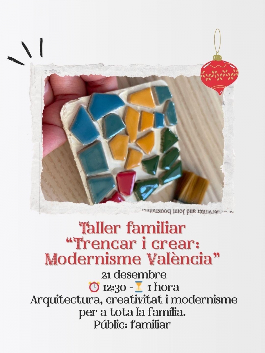 Descripció: En este taller explorarem el modernisme en l’arquitectura valenciana a través d’exemples de la ciutat com el Mercat Central o l’Estació del Nord. Finalment posarem en pràctica allò aprés amb el nostre propi mosaic de trencadís.